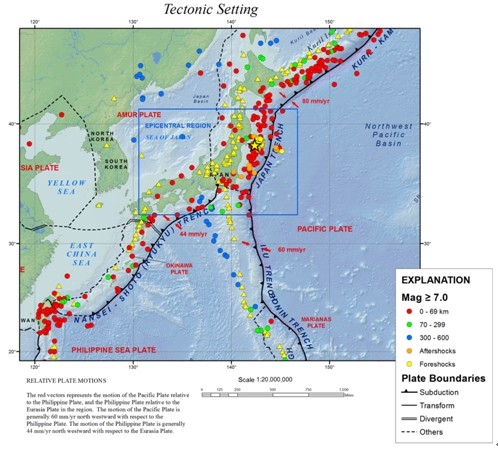 日本位于西太平洋地區(qū),這次地震發(fā)生在太平洋地震帶的日本海槽上,是太平洋板塊向歐亞板塊俯沖而引發(fā)的(圖1),屬于板緣地震。據牛津大學專家研究,地震發(fā)生的日本海槽走向南北,斷層傾向西,傾角15-20°。