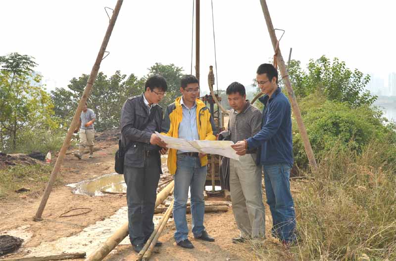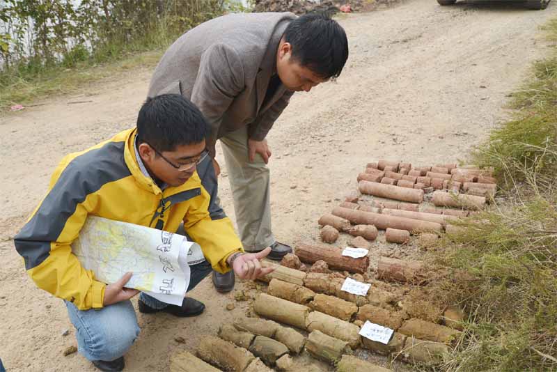 10月22日,羅登貴副院長一行對(duì)項(xiàng)目進(jìn)行中期驗(yàn)收,了解施工單位實(shí)施過程中所遇到的困難,解決了相應(yīng)問題,交待安全生產(chǎn)及地方協(xié)調(diào)等注意事項(xiàng)。蔡永建總工、雷東寧工程師及胡慶碩士仔細(xì)核對(duì)了鉆孔位置、現(xiàn)場(chǎng)編錄,記錄巖心性狀、分析巖心揭露的信息,商討和布置下一階段的鉆探工作。