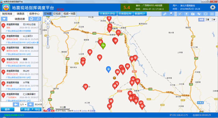 2016年7月31日17時(shí)18分,廣西梧州市蒼梧縣(24.08°N,111.5°E)發(fā)生5.4級(jí)地震,地震造成了廣西、廣東、湖南等多地有感。地震發(fā)生后,應(yīng)中國(guó)地震局震災(zāi)應(yīng)急司號(hào)召,我院蔡永建副院長(zhǎng)、胡慶碩士隨秦小軍副局長(zhǎng)領(lǐng)隊(duì),于7月31日當(dāng)晚出發(fā)、8月1日凌晨4點(diǎn)抵達(dá)地震現(xiàn)場(chǎng)。在此次地震應(yīng)急工作中,“地震現(xiàn)場(chǎng)災(zāi)害調(diào)查與指揮調(diào)度平臺(tái)”提高了現(xiàn)場(chǎng)調(diào)查的工作效率,保障了調(diào)查資料的實(shí)時(shí)上傳與下達(dá)、及時(shí)匯總,減輕了調(diào)查隊(duì)員的工作強(qiáng)度,實(shí)現(xiàn)了中國(guó)地震局震災(zāi)應(yīng)急司對(duì)該系統(tǒng)的工作要求,并獲得了應(yīng)急司、廣西局、湖南局等專家的一致好評(píng)。