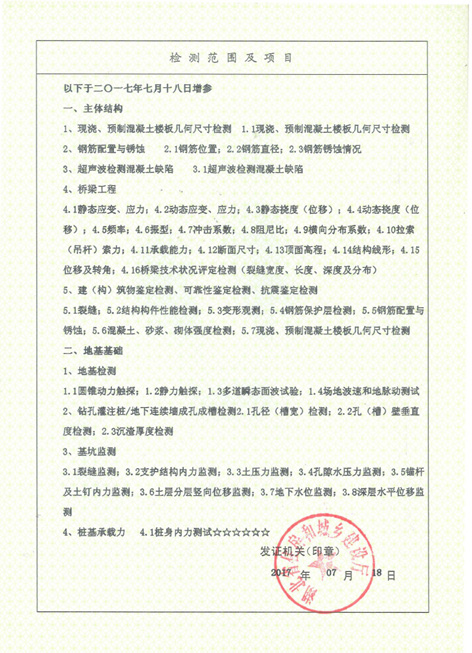 經(jīng)過(guò)全體員工一年半的不懈努力,震泰公司順利通過(guò)橋梁工程檢測(cè)參數(shù)計(jì)量認(rèn)證,并成功獲得橋梁工程檢測(cè)新資質(zhì),這是公司資質(zhì)建設(shè)工作取得的又一重大成果。橋梁工程檢測(cè)新資質(zhì)包括橋梁動(dòng)態(tài)和靜載荷試驗(yàn)、橋梁技術(shù)狀況評(píng)定、橋梁施工狀態(tài)監(jiān)測(cè)中涉及到的各項(xiàng)參數(shù)。該資質(zhì)的獲得,不僅促進(jìn)了我司企業(yè)資質(zhì)體系的進(jìn)一步完整,而且為優(yōu)化產(chǎn)業(yè)布局、實(shí)現(xiàn)業(yè)務(wù)拓展打下基礎(chǔ)。我司將積極開(kāi)展橋梁工程檢測(cè)業(yè)務(wù),以科學(xué)、公正、嚴(yán)謹(jǐn)?shù)墓ぷ鲬B(tài)度,竭誠(chéng)為廣大客戶(hù)提供誠(chéng)實(shí)守信、高效優(yōu)質(zhì)的服務(wù)。